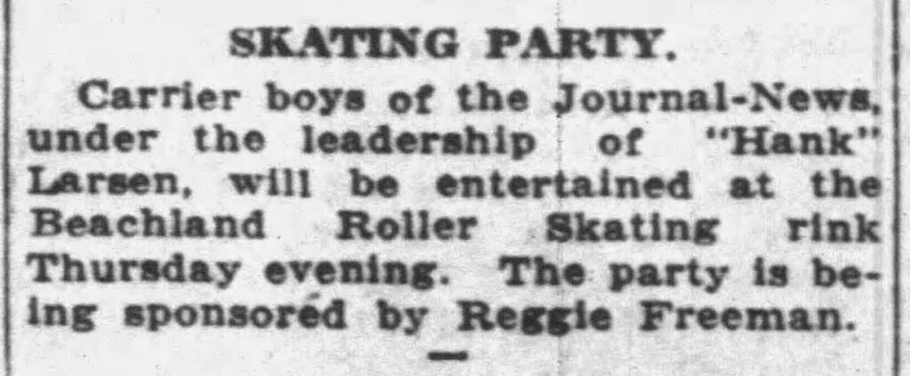 Racine Journal News, December 28, 1927. Skating party for newspaper carriers sponsored by Reggie Freeman, who would have been 23 years old at the time.Racine Journal News, February 7, 1931. And here’s still another sign that spring is really here: “Reggie” Freeman is out on the street with his car of many parts. In other years he never came out with that car until the Fourth of July, but this year he broke the rule, the streets being free of snow and ice and there being no danger of harm coming to his pride.Racine Journal News, May 21, 1931. To Hold May Party at Rainbow Gardens, formerly known as Beachland.Racine Journal Times, December 31, 1936. Reggie Freeman is featured in Highlights of the Year.Racine Journal Times, April 22, 1942. Sacrifices Car in Salvage Drive. Racine Journal Times, April 13 1949. Smoke billowed and flames shot 15 to 30 feet through the roof when fire destroyed the Beachland Amusement Park and roller rink on Racine’s North Beach late Tuesday afternoon. Five alarms brought all except two pieces of the city’s fire equipment to the scene. No one was injured, but damages are expected to exceed $50,000.1433 Michigan Boulevard in 2024.Racine Journal Times, May 26, 1950. Announcing the Grand Opening Tomorrow, Sat., May 27th – 7:30 p.m. Reggie Freeman’s Grand New Rollerina Skating Rink, 1615 Murray Ave. (Corner of Murray Ave. and 17th Street.)Kathi Bogucki says that her parents met at the Rollerina Skating Rink and that these photos are marked 1953.1615 Murray Ave. in 2024.Son. Reginald D. Freeman. June 30, 1904 to Sept. 2, 1963. Graceland Cemetery, Racine, Wis.