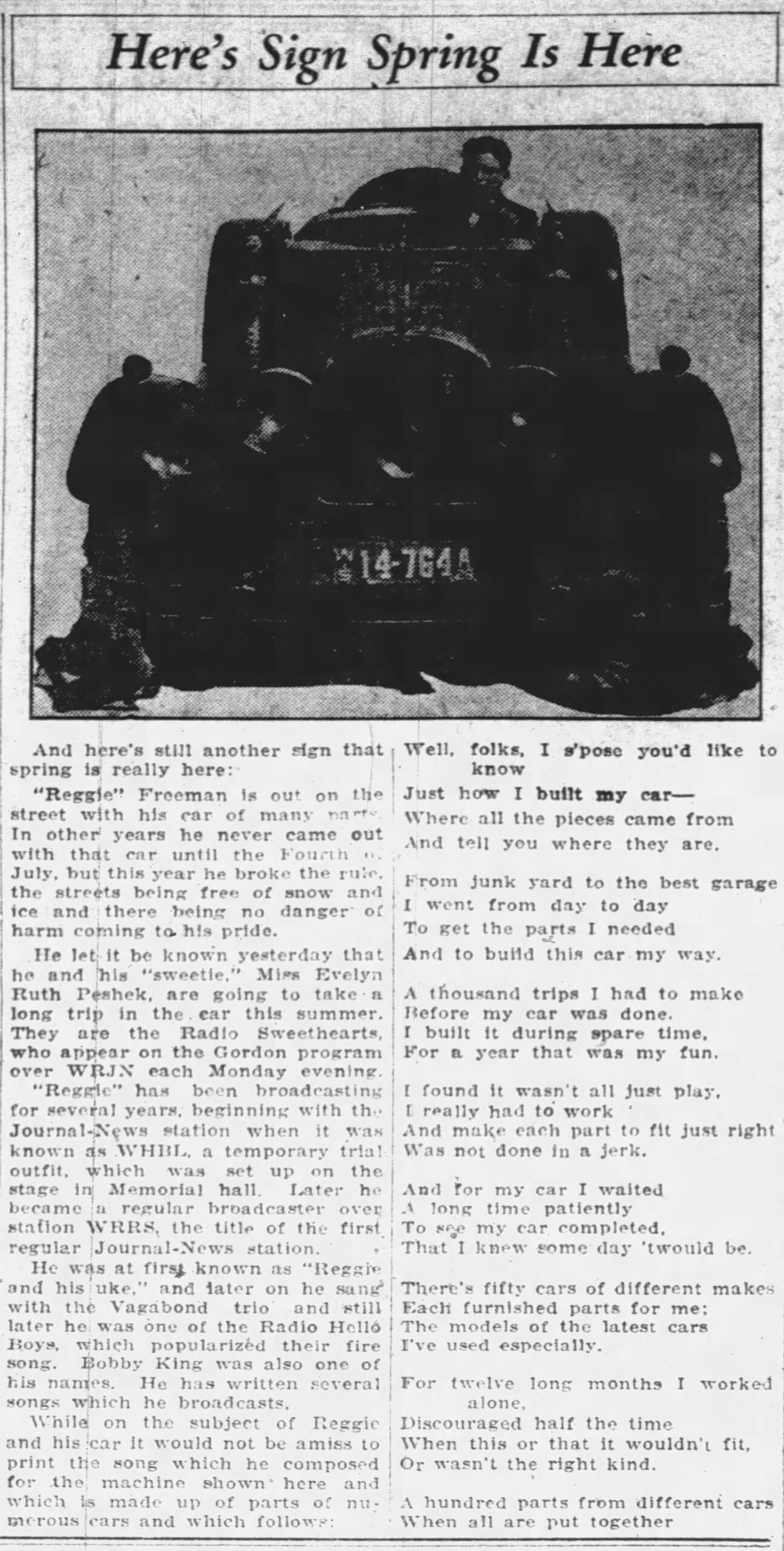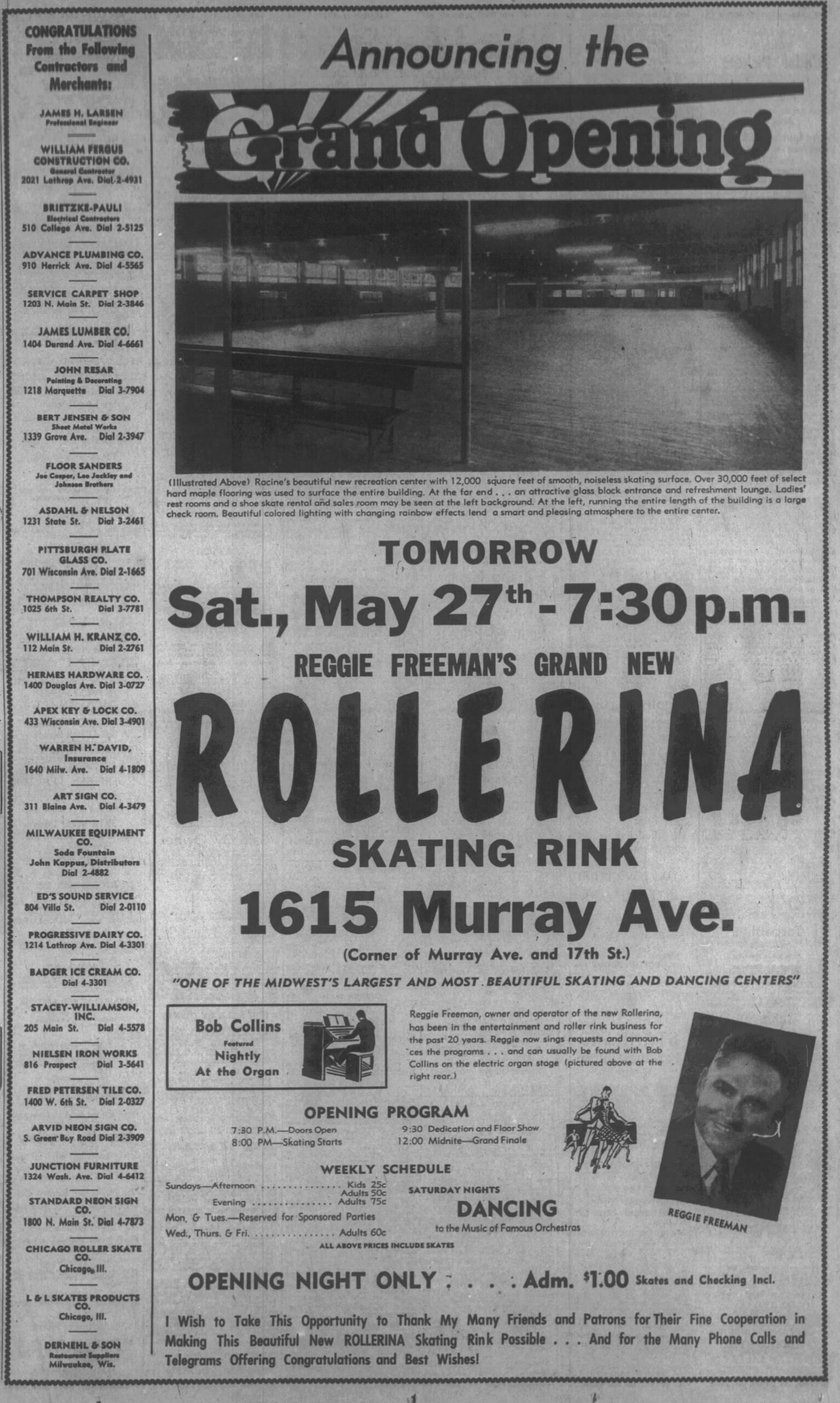 Racine Journal Times, September 3, 1963. Freeman Dies; Ran Roller Rink Reginald D. (Reggie) Freeman, 59, coin machine distributor, and one-time roller rink operator, died Monday in St. Luke’s Hospital. Freeman operated the former Beachland Roller Rink on the lakefront at the foot of Kewaunee St. and former Rollerina Rink and Ballroom at 17th St. and Murray Ave. Born in Racine, Freeman was one of the first singers on WRJN, starting in 1923. He also composed music. His first song in 1933 was for a March of Dimes benefit honoring Pres. Franklin D. Roosevelt. After Eisenhower’s re-election Freeman composed “Hail to Our President,” which was sung at Inauguration Day events in Washington in 1957. He was a charter member and past president of the Racine Exchange Club, which was established in 1948. A sports car Freeman built in the 1930s attracted national attention. Built of scrap copper from a raided still and 1,001 parts from more than 50 automobiles, the auto carried such passengers as Fredric March, Tom Mix, Rear Adm. Richard E. Byrd, Wayne King, Mae West, Red Grange, Doris Day and Jack Dempsey. Freeman said his interest in automobiles stemmed from his youth when polio crippled him. Survivors include his wife, Frances, and two sons, Frederick of Milwaukee and Roland of Hales Corners. Funeral services will be held Thursday at the funeral home at 1001 High Street.