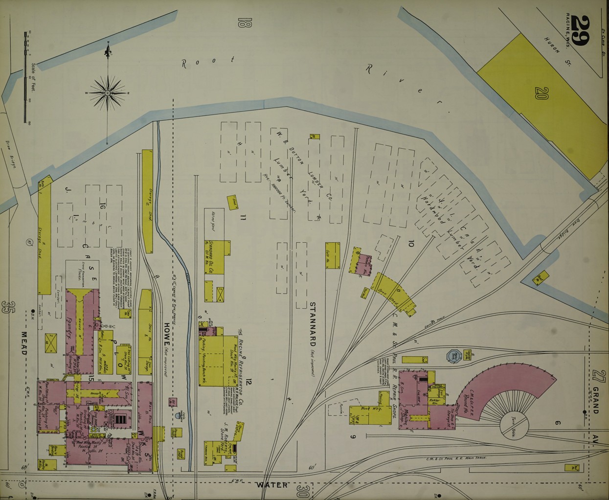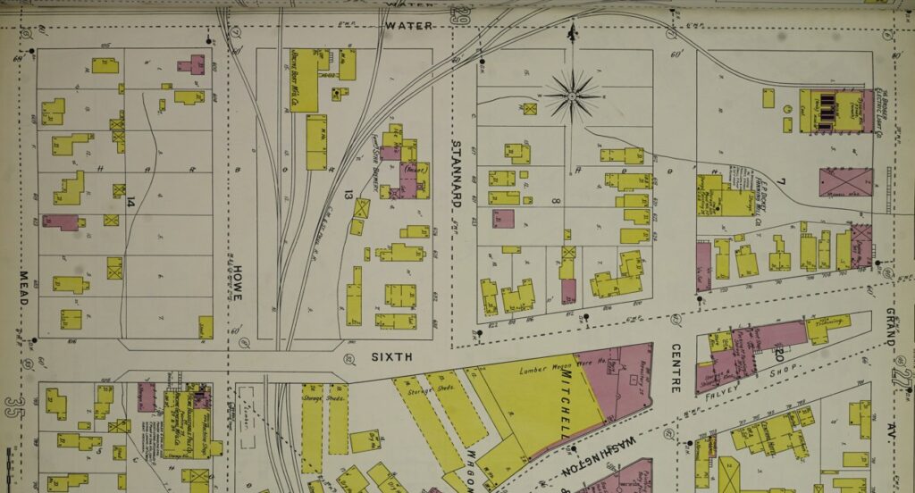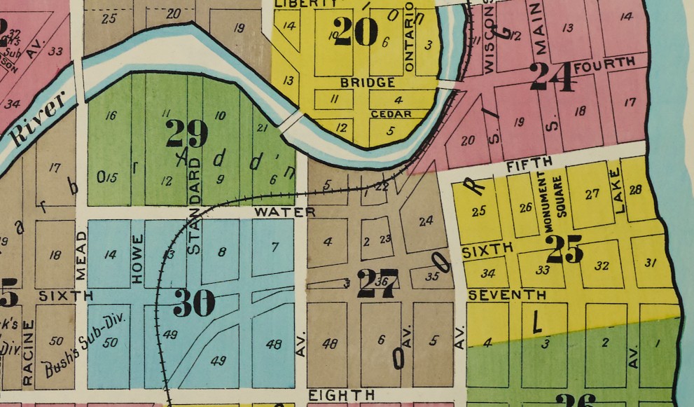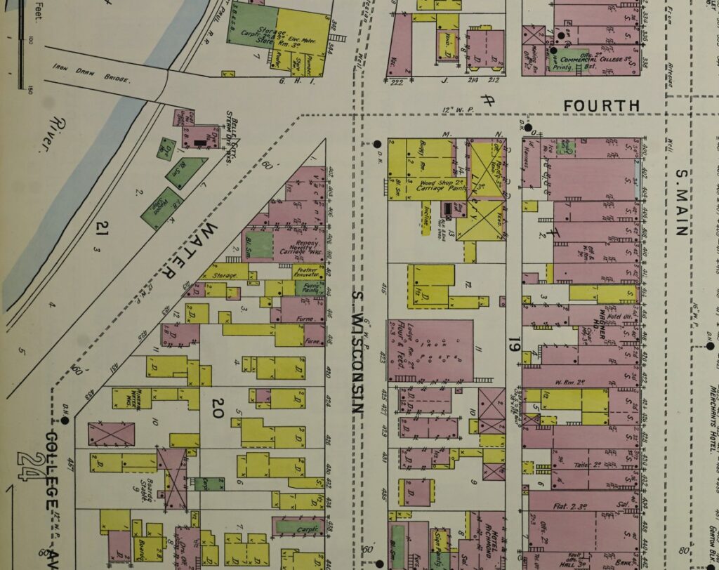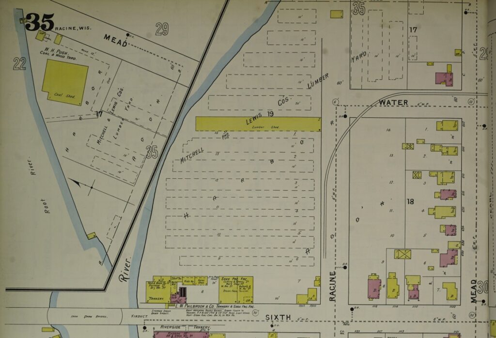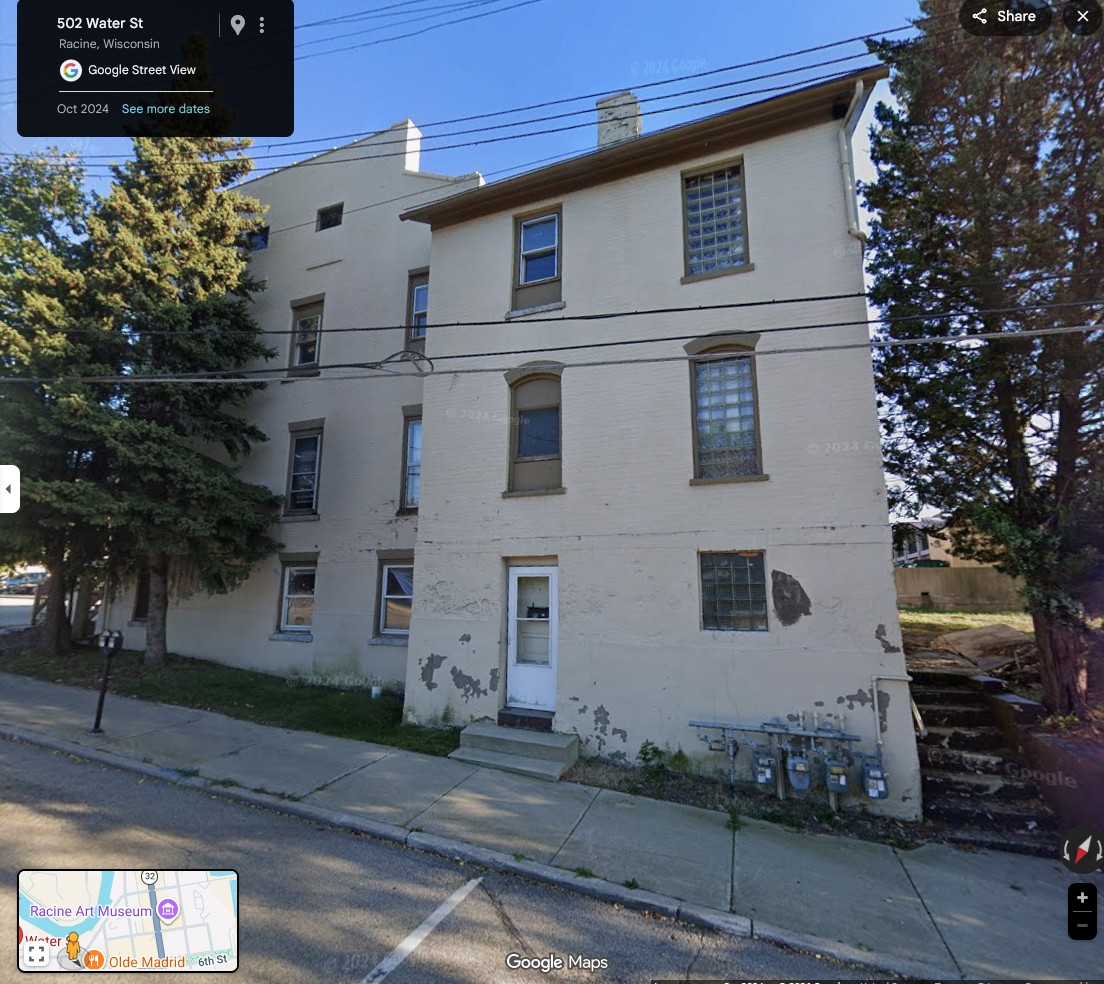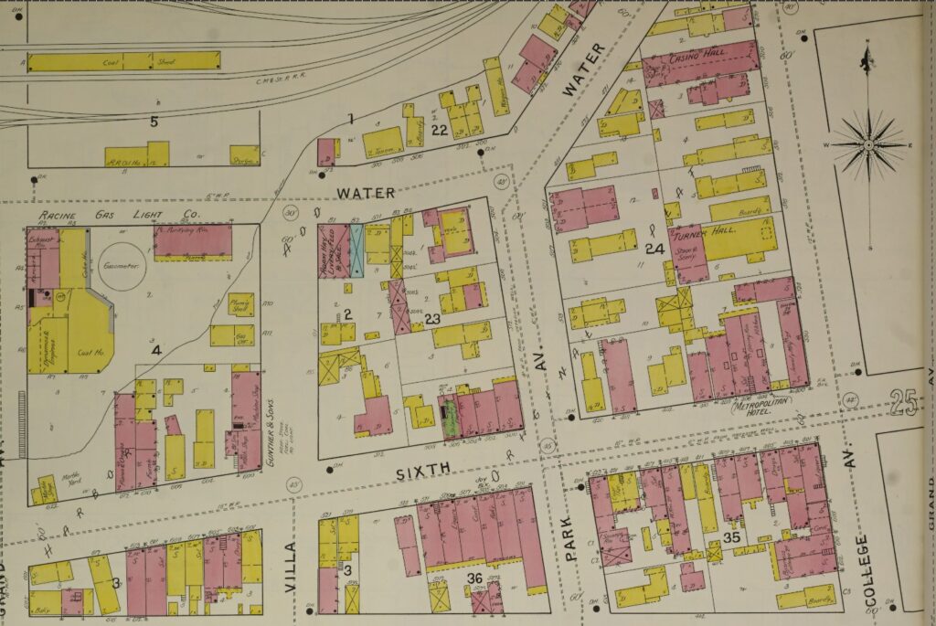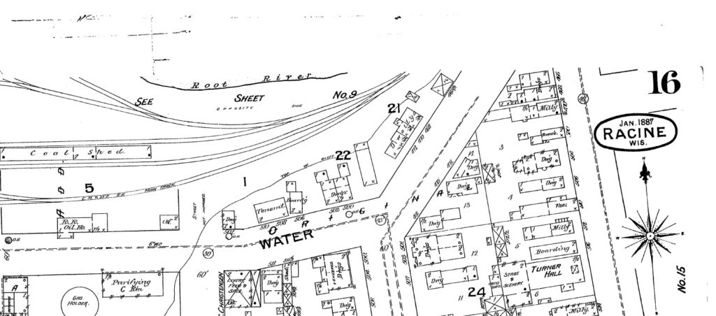 Water Street in Racine always struck me as a very old part of the city. This map showing Water Street is from the 1894 Sanborn insurance map.I am probably most familiar with the intersection of Water Street and Park Ave. and the duplex which served as a rectory for some time. Notice all the buildings that used to be between Water Street and the rail area to the north.500 and 504 Park Avenue, which sits at the corner of Park Avenue and Water Street. This photo is from Dennis Tully and is from about 1870.Here is the part of Water Street that continues northeast along the Root River and runs into 4th Street and South Wisconsin Ave. I have rotated this map so that north is at the top. From the 1894 Sanborn insurance map.Here is Water Street continuing west from Grand Ave. past Mead Street to Racine Street, showing all the factories between Water Street and the Root River. I have rotated this map so that north is at the top. From the 1894 Sanborn insurance map.Here is the south side of Water Street between Grand Ave. and Mead Street (now called S. Marquette) showing the Racine Boat Mfg. Co. and a somewhat more residential neighborhood compared to the factories on the north side of Water Street. I have rotated this map so that north is at the top. From the 1894 Sanborn insurance map.And finally, here is Water Street ending at Racine Street near the Mitchell and Lewis lumber yards. From the 1894 Sanborn insurance map.Compare this 2026 Google Maps image of Water Street to the 1894 maps and you can see that all of the factories and most of the apartments and boarding houses are gone. Mead Street is now S. Marquette Street in this area.This building right around the corner from 500-504 Park Avenue may or may not be a separate building. It appears to have the address of 503 Water Street, but the 3 is missing from the sign. I can see by the gas meters that there are at least four units in this building, accessible by the stairs to the right.Look at these tiny houses marked “Dwell’gs” near the bold number 21 on this 1887 Sanborn map. 472, 470, and 468 Water Street not only were tiny, but backed up against the railroad tracks. Can you imagine how noisy it would have been to live in these houses?