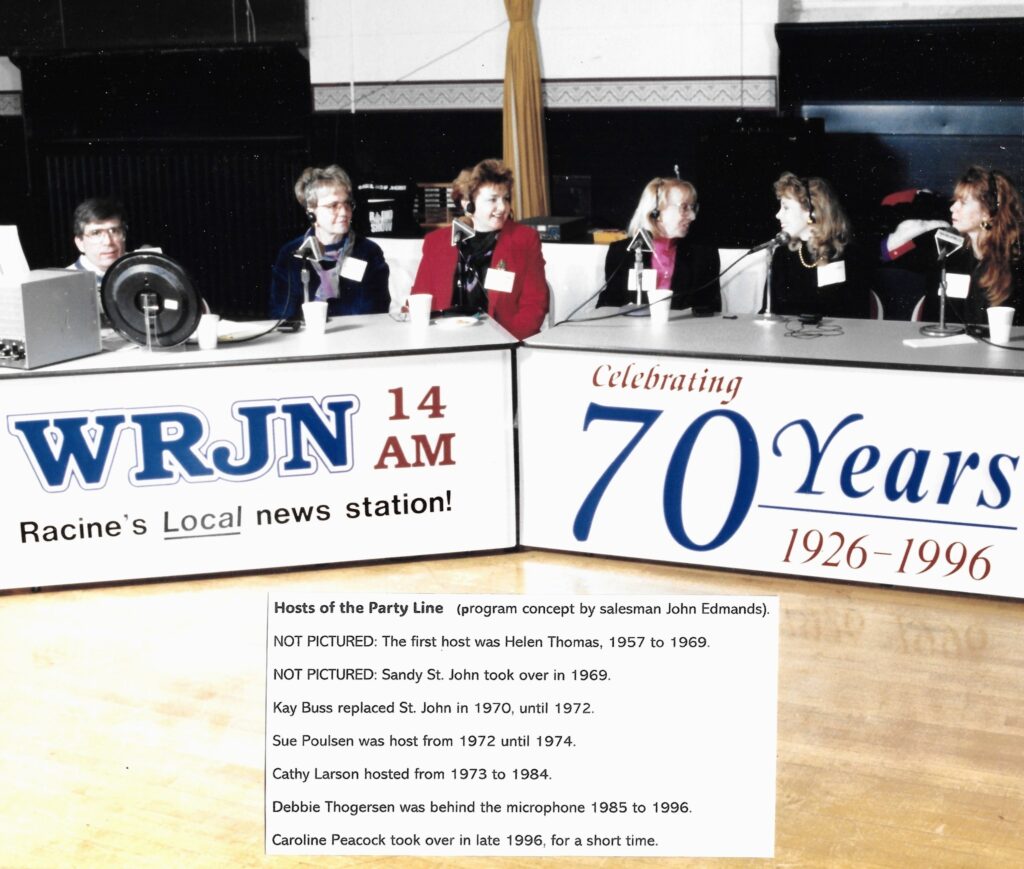 WRRS Now WRJN, Racine Journal News, May 3, 1928WRJN advertisement in the Racine Journal News, March 2, 1931Racine Journal Times, March 21, 1938 Janet Hoff Karkow: That’s the 3rd floor of the American Bank Building, now the Racine Art Museum.Janet Hoff Karkow posts: In response to the post about “Party Line” on WRJN, here are five of the hosts at the 70th Anniversary show in 1996. They are Kay Dawson, Sue Poulsen, Cathy Larsen, Debbie Thogersen and Caroline Peacock. Party Line was started in 1957 by Helen Thomas. She was replaced by Sandy St. John. The show ended around 1997. The Helpful Hints index cards, unfortunately, no long exist.Janet Hoff Karkow to Wendy Poulsen: “Your mom was the 4th host of Party Line from 1972-74. It was started in 1957 by Helen Thomas. BTW, your mom attended the station’s 70th anniversary at Memorial Hall in 1996, creating a one of a kind photo in the JT.”Janet Hoff Karkow posts: Before all the homes, and the radio station itself as of late 1957, a transmitter building and the tower existed. Engineers stayed there, while the programs took place downtown.Janet Hoff Karkow: Transmitter building made to blend in. This was Mt Pleasant.